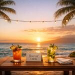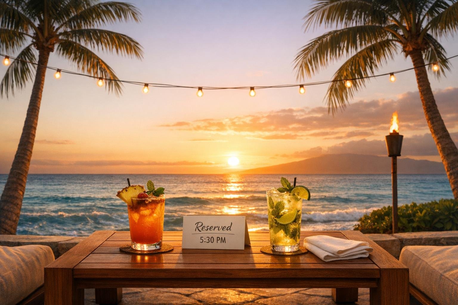 Book oceanfront Maui tables 30–60 minutes before sunset; reserve early (many open 60 days ahead at 6:00 AM HST) and check cancellations 24–48 hours before.